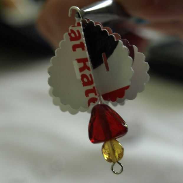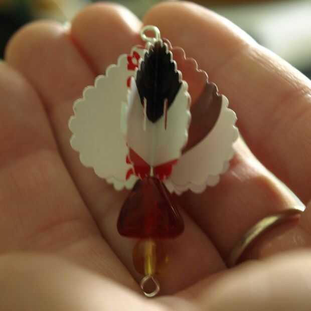 En primer lugar, encontrar sus pernos de cabeza de 2 pulgadas y llevarlos a su tira de papel. Poner dos o más cuentas en el perno de cabeza. Se trata de la parte superior de la pendiente. Quieres dos colores coordinación que coinciden con su tira de papel. Una vez hecho esto, encontrar el hueco en el centro de la tira de papel e Inserte el pasador de cabeza en el centro, asegurándose de su aro y granos en la parte superior como se ve en la foto dos arriba.