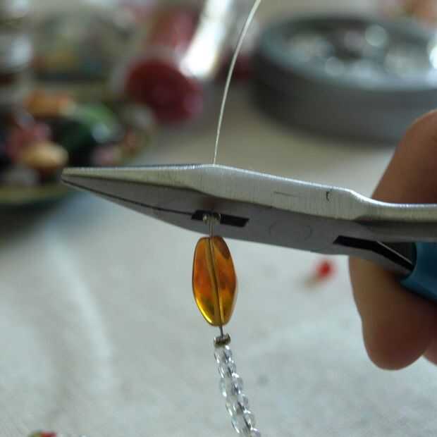 Después de agregar los granos de acabado necesita un grano prensado para asegurar la pieza. Un grano de la encrespadura por strand debe debido. Corte el exceso de cable como se ve en la foto. Corte como el grano de la encrespadura como sea posible.
