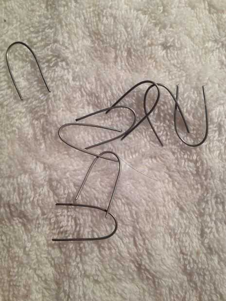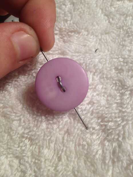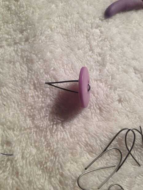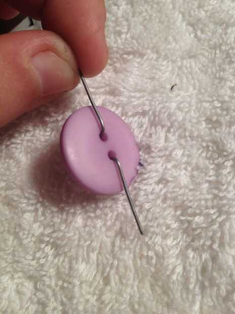 cada uno de lo alambre doblar por la mitad, pero sólo parcialmente como doblar en la primera foto. utilizando un botón y un hilo de alambre ambos extremos del cable a través de un ojal y luego enderezar los cables en la parte trasera el botón. hacer esto para todos los cables y botones y asegúrese de que los botones se enfrentan a la manera correcta.