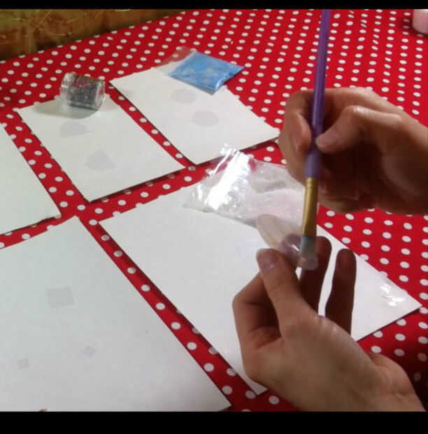 Aplique una capa de Mod Podge o PVA pegamento sobre el lado del campo, y luego cubrir generosamente con brillo!