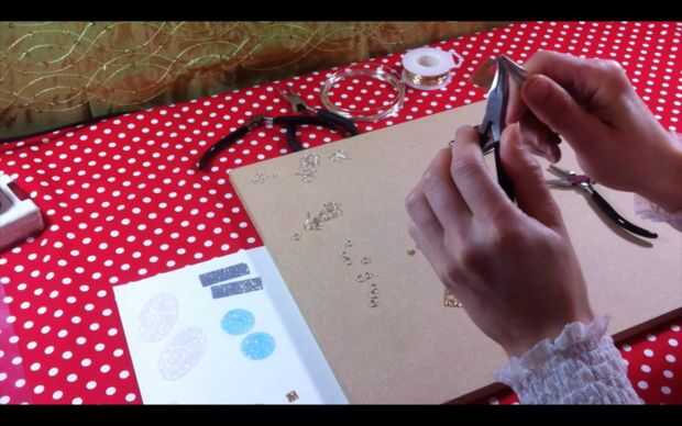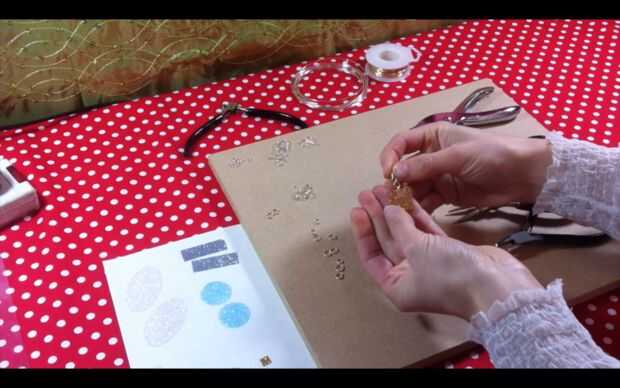 Crear agujeros para los anillos de salto usando un sacador de agujero único o un taladro y coloque sus anillas y ganchos de pendiente usando alicates doblados de la nariz y nariz de cadena.