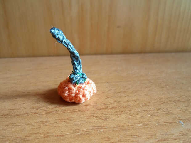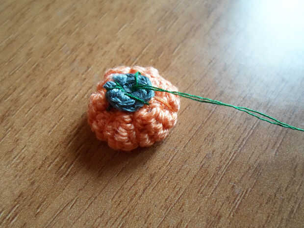 En primer lugar, vio el pequeño círculo verde en la parte superior de la calabaza utilizando aguja e hilo verde.
