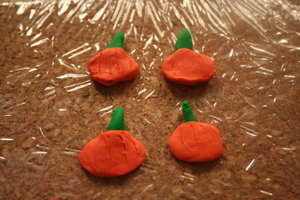 En primer lugar, usar la arcilla naranja y verde para hacer sus calabazas. Estirar y aplanar hacia fuera de un círculo de arcilla naranja para la calabaza y cortar un pequeño trozo de arcilla verde para el tallo. Luego, junte las dos piezas. También puede utilizar un rodillo para estirar tus bolas de arcilla naranja en calabazas uniformemente en forma.