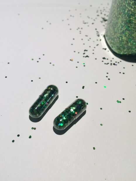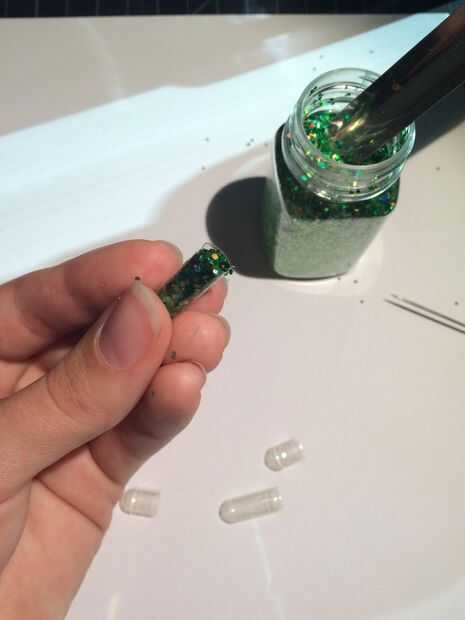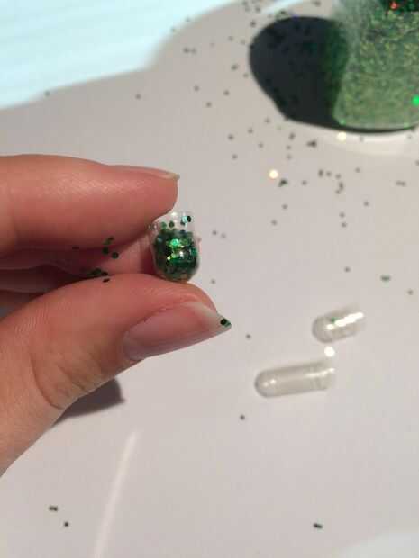 Asegúrese de que sus manos estén limpias y secas antes de manipular los casquillos del gel (demasiada humedad en la piel puede hacer la cápsula blanda). Si usas brillo de un tarro, una cucharada de grano como el mostrado es bastante fácil de sacar brillo a la cápsula. Llenar la mitad más grande de todo el camino, luego llene la mitad más pequeña sobre todo a mitad de camino.