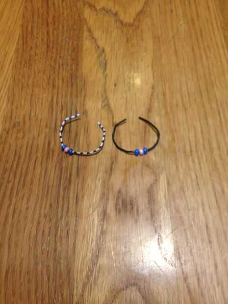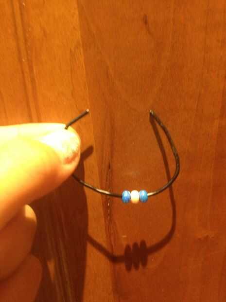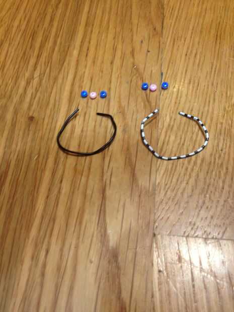 Necesita seis granos de tres para cada uno de los clips de papel. Deslice las bolas en el clip. Mina, en un patrón, pero usted puede poner de todos modos usted quiere. Incluso puede hacer más de tres granos. Después de haber terminado un pendiente de abalorios Repita con el otro. Ahora estamos con este paso y pasar a la última etapa! ¡ Yay!