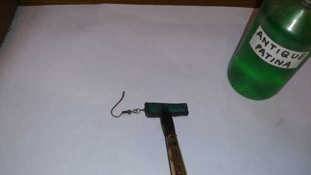 Aplicación de pátina es opcional porque el acabado será buena pero si quieres un look más antiguo podría aplicar pátina cobre. Este producto químico es un ácido así que por favor manejar con precaución. Use guantes y protección ocular de seguridad. Si usted consigue cualquier rastros de remojo las manos en agua para eliminar el ácido. La pátina se aplica con un pincel. El cambio en la apariencia es casi inmediato y limpiar los pendientes en agua de jabón para quitar la capa de fundente y pulir con un sellador de metal.