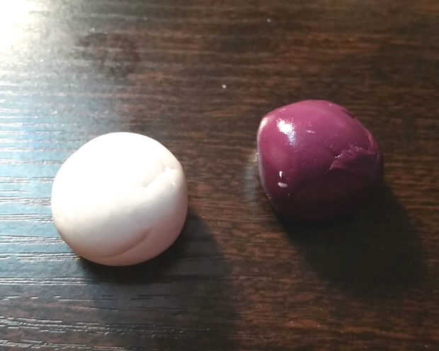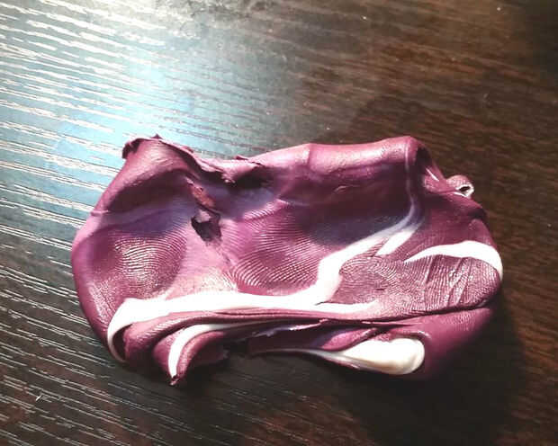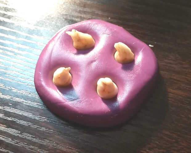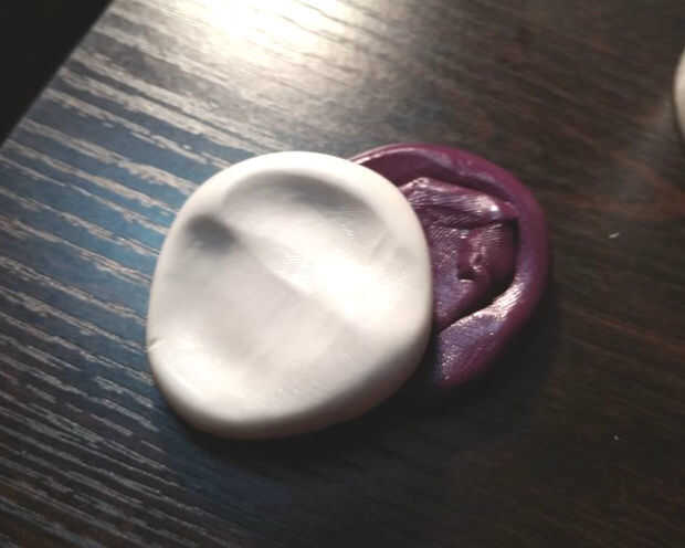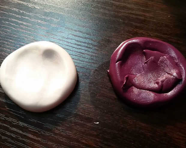 El molde que hace el medio que utilizaba vino en dos partes que se necesitan para mezclar partes iguales y luego tienes muy poco tiempo para hacerlo en la forma que desee. Mezclé las dos partes de la el molde haciendo medio juntos hasta que no hubo rayas izquierda, rodado en una bola y aplanado hacia fuera suficiente para cómodamente por todos los cuatro dientes. Casi pegué los dientes hasta el molde, que habría sido malo, así que asegúrese de que su molde es lo suficientemente profundo para obtener una buena impresión de los dientes sin hacer agujeros en la parte inferior!