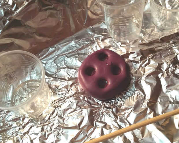 La resina que usa era una resina de solidificación rápida, lo que significa que tiene que trabajar rápido. Se mezcla en proporción 1:1, que le permite de manera más fácil. Yo uso este pequeño tazas para medir cada parte, a continuación, vierta dos tazas en un tercio de la taza y mezclan. Si usas esta resina particular, usted notará la resina Haz ligeramente nublado como se está mezclando, pero continuar. Una vez que la resina se vuelve claro, se mezcla bien y listo para servir. Vierta cuidadosamente en el molde. Las aberturas son muy pequeñas y no tienen tanta resina, accidentalmente la desbordó mío al principio, pero es fácil de cortar cualquier extra después.