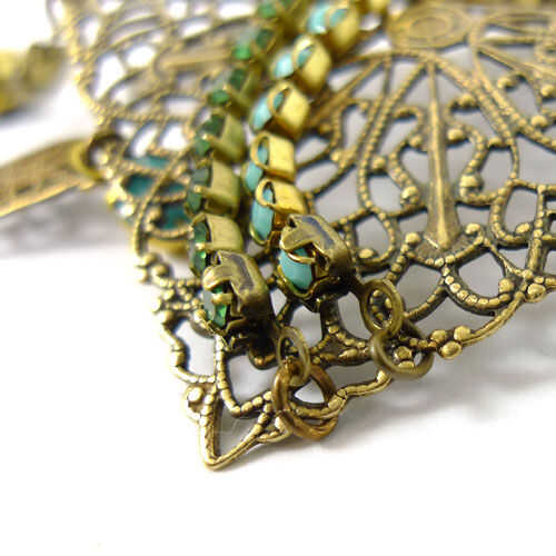 Con 2 anillas fije una sección de piedra 12 de cadena al frente de la Plaza una filigrana, como se muestra. Tenga cuidado de que la cadena enfrenta hacia adelante. Repetir, asociar una sección de piedra 14 de cadena debajo de la sección 12 de la piedra.