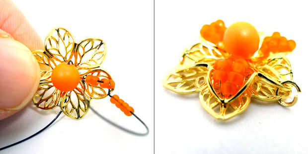 Pila la flor abalorios con una flor plana, de nuevo tocando y pétalos alineación. Uso saltar anillos para conectar los puntos de pétalo unbeaded a sus compañeros de filigrana plana. Ponga a un lado.