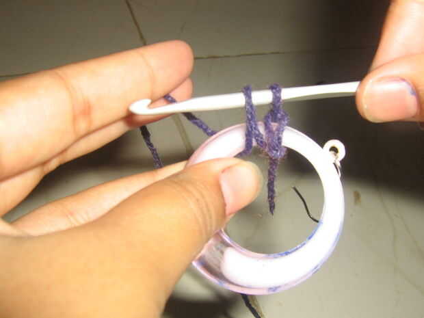 Insertar la aguja a través de la pendiente y tire de la lana por el centro, luego tire el hilo a través del primer lazo.