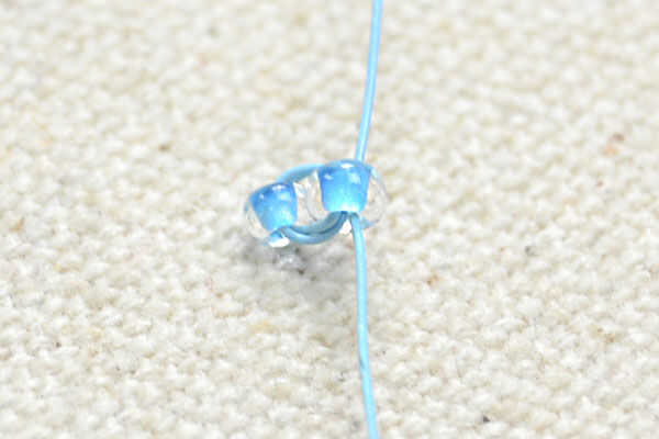 2 º, para hacer la fila 1, necesitará: dos rocallas azules de la secuencia. Dejar 3 ~ cola de alambre largo 4cm. Enrosque el otro extremo del alambre a través de dos granos de la semilla dos veces para salir sobre el primer grano de semilla;