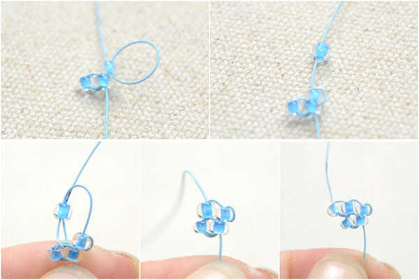 3 º, en fila 2, en primer lugar añadir un grano de semilla azul, pasar cables el grano de semilla mayor. Tire del cable perfectamente. A continuación, un grano de semilla azul de la secuencia, pasar el alambre a través del bucle del cable expuesto en fila 1 y luego para arriba a través de la última grano. Apriete el cable. Por último, añadir un grano de semilla azul, pasar por el mismo lazo de alambre expuesto en fila 1, el grano recién agregado y tire tenso;