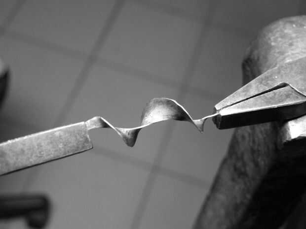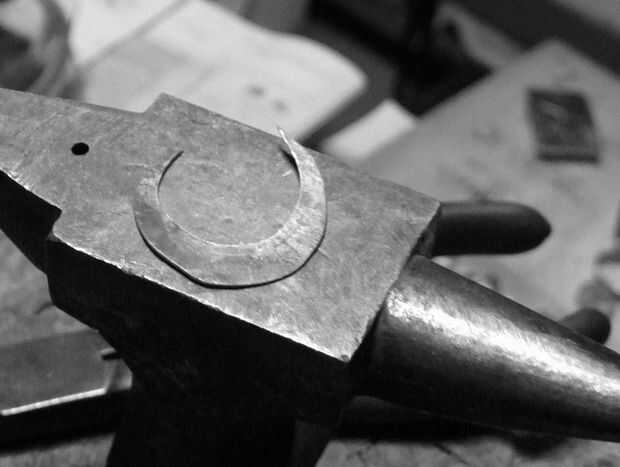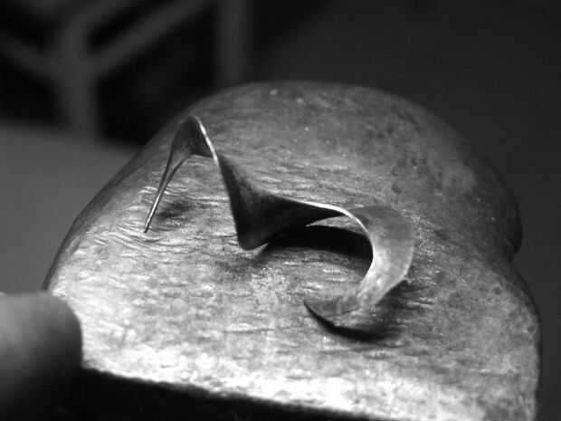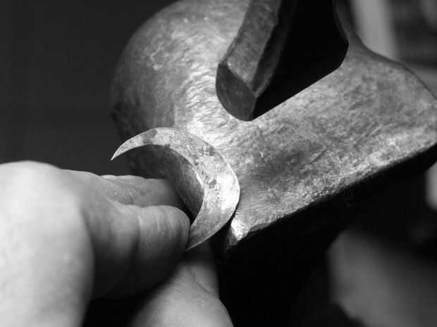 necesita un martillo, un juego, un par de pinzas y una media luna en forma de hoja de metal (latón, cobre, aluminio, plata, de hierro) sobre 1 mm de espesor. Empezar a martillar el borde exterior de la media luna, a mitad de camino que encontrará que usted debe invertir. Vaya percusión en toda la longitud de la arista exterior. Ahora toma las dos extremidades de la forma menearon y tirar recto.