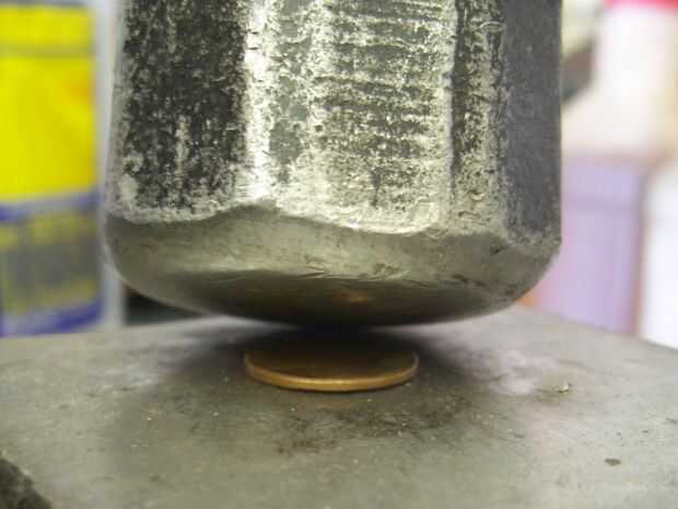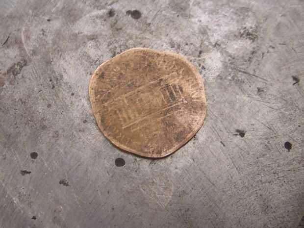 Coloque el céntimo en algo sólido, utilicé la parte trasera de mi mordaza de mesa. Penny, trabajando el metal como uniformemente como sea posible hasta que la plantilla se coloca sobre el material con no más de caída del martillo. Si todavía se pueden ver imágenes antiguas de la moneda que tendrá que estirar un poco más.