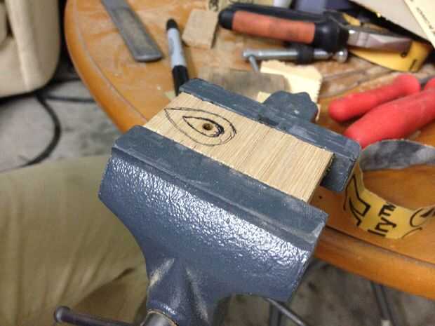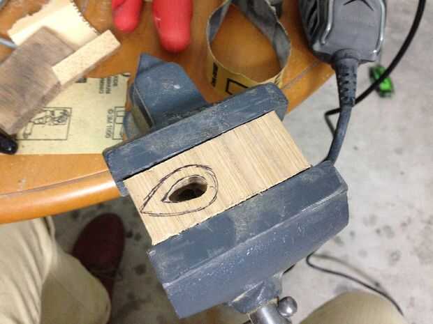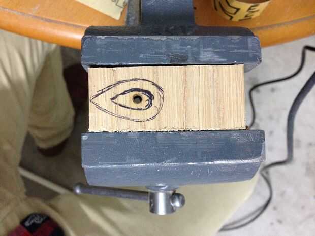 Empecé por un agujero en un pedazo pequeño de 1/2" roble de perforación con taladro de medio trabajo viejo de mi papá. Después de la ampliación por el taladro alrededor de torque, utilicé una redonda pequeña y media vuelta archivo para quitar el resto de la cosa del agujero central. Los archivos se está convirtiendo rápidamente en mis herramientas preferidas. Ellos me obligan a trabajar lentamente para que no correr alrededor y matar mi proyecto, sin embargo, son todavía tan útil. De todos modos...
