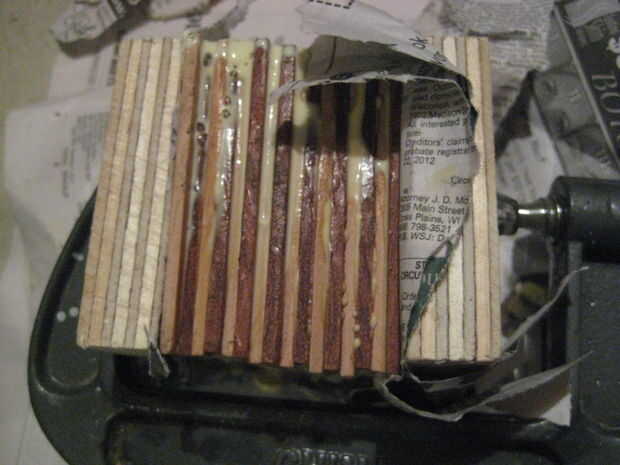 Pegar es bastante simple. Sólo aplique el pegamento generosamente a una superficie con un cepillo y colocar la siguiente pieza en la parte superior. Gire alrededor de un poco para extender el pegamento más. IMPORTANTE: Asegúrese de alinear el grano de la misma manera y alternar el tipo de madera. Es fácil de estropear cuando todo está cubierto de pegamento.