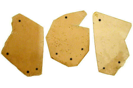 Pone sus formas de mica al lado de uno y decidir donde quieres los ojales. Puede marcar los puntos con un lápiz. Coloque los agujeros por lo menos 1/4 de pulgada (1 / 2cm) de los bordes de la mica para asegurarse de que no tiran a través más adelante.