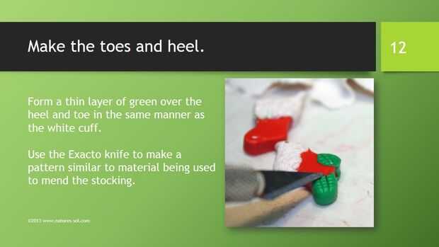 Forman una fina capa de verde sobre el talón y la puntera de la misma manera que el brazalete blanco. Utilice el cuchillo del Exacto para hacer un patrón similar a un tejido de tela que se utiliza para reparar la siembra.