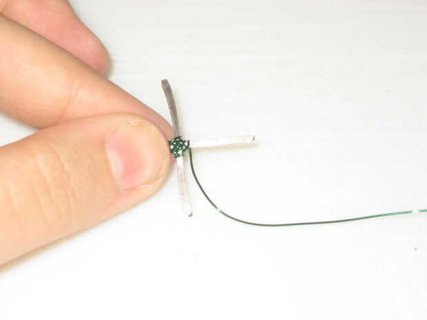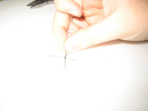 Sujeta las dos piezas planas por lo que hacen una cruz, envuelva el extremo del alambre más pequeño alrededor de la intersección, envolviendo el extremo corto alrededor para conseguir un asimiento firme.