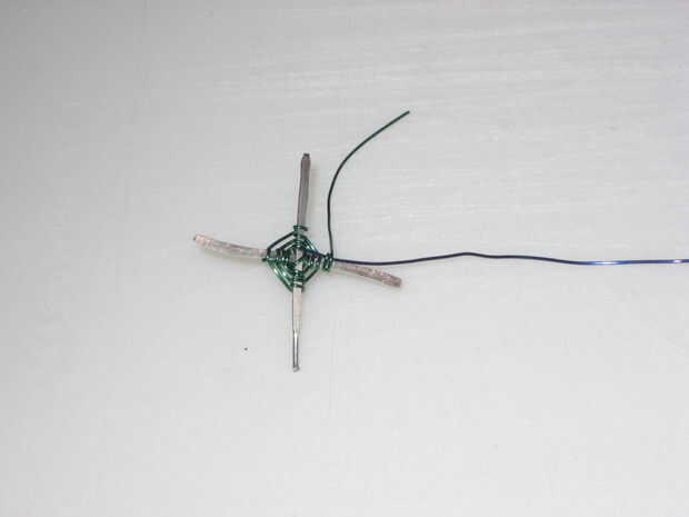 Desenvuelva el último abrigo que terminado y envuelva otra vez sobre el nuevo cable (con el cable nuevo en la parte posterior). Envuelva el primer color alrededor del poste y alambre de nuevo dos veces. Comenzar con el nuevo color.