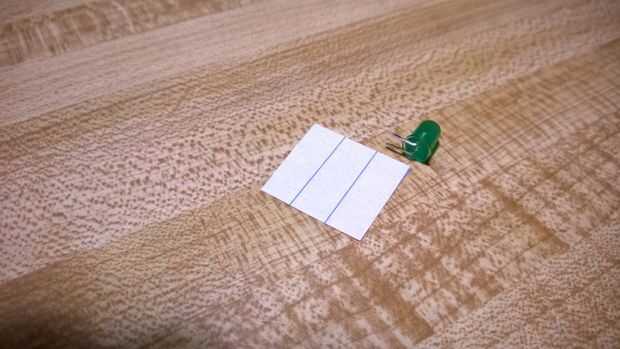 Cortar los cables de LED a 8mm (una línea en el papel de regla de colegio) y doblar los alambres como se muestra en la imagen. Sería útil recordar que el extremo es positivo y que es negativo. LEDs la mayoría tendrá un labio en la parte inferior del plástico que le ayudarán a saber cuál es cuál.