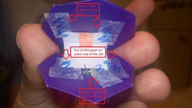 A continuación necesitamos nuestras "pilas" de la cinta en su lugar. Empezar por grabar la cara con la luz del LED para que no salga de su agujero. Cinta de papel a ambos lados del LED a la estrella púrpura y también colocar un trozo de cinta sobre el descubierto con el extremo positivo del LED. Ahora Alinee su otra estrella púrpura para crear la parte posterior de la pendiente. El papel debe ser grabado en la parte posterior de la estrella púrpura, sin cubrir por la cinta de cobre. (Una vez más, si confunde-ver las fotos.)