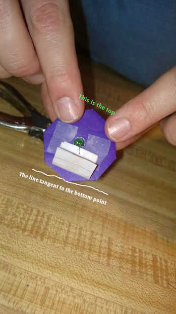 La parte inferior de la pendiente es el punto enfrente del punto que ha marcado. Tienes que insertar tu luz a través del agujero y orientar para que el doblez del papel es paralelo a la tangente de la línea hasta el punto de fondo. (Si usted está confundido, como mi esposa, ver la foto de arriba. Es importante que el papel está colocado correctamente si desea que el pendiente para trabajar).