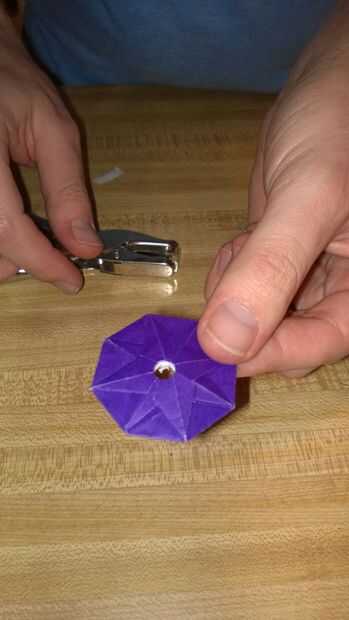 Sus dos piezas estrella púrpura y hacer un agujero en el centro de una. Marcar una de las esquinas como la parte superior (no importa cuál, pero será un buen punto de referencia más adelante) en el interior. Tenga a mano la otra estrella. Estas dos estrellas se unirán para hacer un pendiente.