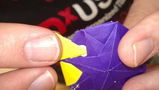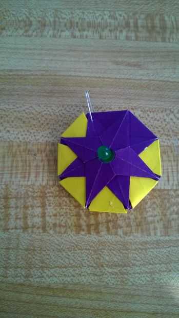 Ahora es el momento para pegar en las piezas del triángulo amarillo para hacer el centro púrpura estrella destacan. Como se muestra en la foto, asegúrese de insertar el triángulo que une los dos discos púrpura y entra debajo de la superficie de la estrella centro púrpura en cada disco. Es importante dejar dos triángulos sin pegar a la derecha o la izquierda del gancho del pendiente para permitir que un lugar para una batería de insertarse.