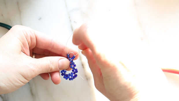 Permite añadir una flor en la parte superior solo por diversión. 2 granos de cada cable del hilo de rosca. Sostener ambos granos en el lado izquierdo y la cadena el cable de lado derecho a través de ambos granos. Ahora hacer lo mismo al otro lado. Sostenga ambas cuentas en el lado derecho y la cadena el cable del lado izquierdo a través de ambos granos. Tire con fuerza.