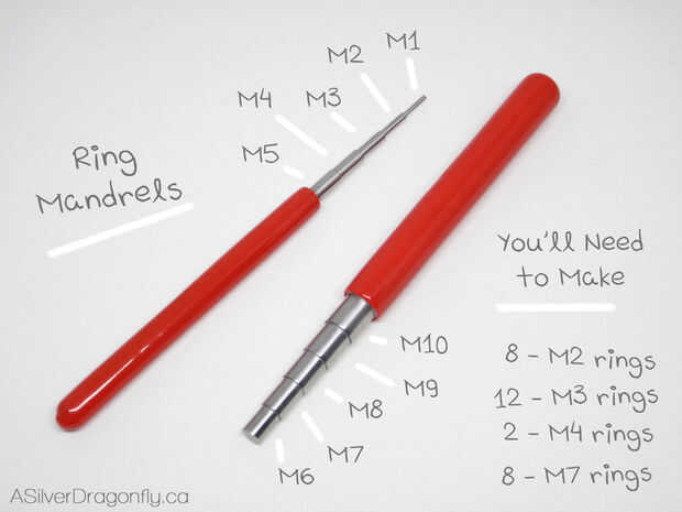 Para hacer las cosas un poco menos confuso para este tutorial voy a nombrar los diferentes tamaños en mis mandriles M1-M10. Yo he marcado con la imagen de mis mandriles con estos nombres y cuántos anillos te quieren hacer con cada tamaño. Dependiendo de sus mandriles y el tamaño de alambre que utilizas puede que necesite jugar con diferentes tamaños de anillos hasta encontrarlos que funcionan.