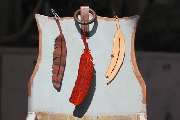Los pendientes están hechos de chapas laminados de arce, el nogal y el paduk. Ilustraciones de vectores base de plumas que encontré en línea fueron modificadas y se envían a un cortador del laser. El cortador del laser corta entonces el pendiente de la hoja de chapa de madera. Montaje de la madera a unos ganchos de pendiente y Bob de su tío.