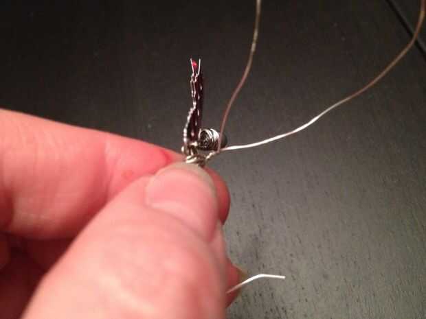 • Unir el cable directamente detrás del orificio. (Asegúrese de que usted deje suficiente cable entre el agujero y los granos que la mariposa no se pega hacia fuera en un gracioso ángulo... Mantenga el talón inferior y la mariposa bastante cerca, aunque, como usted tendrá que envolver el cable completamente hasta el talón para asegurarse de que el gancho se queda ajustados.