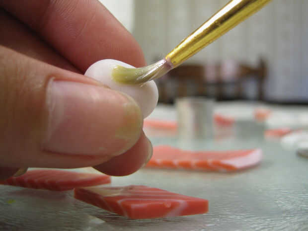 Tomar una gota de la arcilla de arroz y frote un poco de arcilla líquida en la parte superior. Esto ayudará a que la pieza de salmón se adhieren durante el horneado.