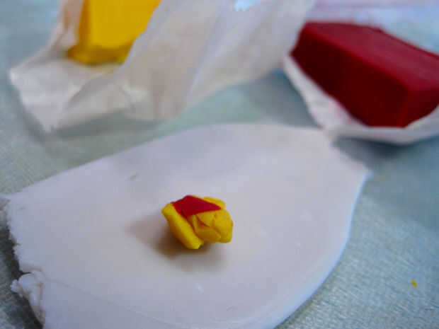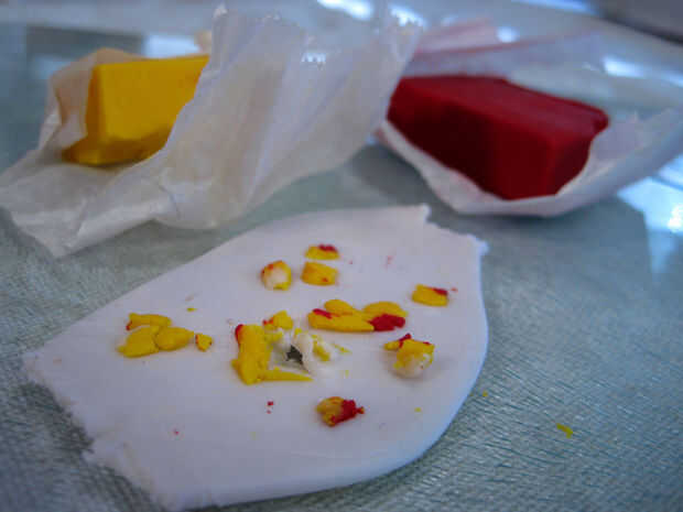 Tiempo para mezclar el color salmón. Tome algunas de la arcilla de arroz (no todo) y picar algunos de los concentrados de color amarillos y rojo. Romper los concentrados se facilitan las cosas; así que habrá una máquina de pasta en mano. Mezclar los colores hasta conseguir un bonito color salmón claro. ¡Ten cuidado! El concentrado lleva una mano ligera para utilizar con eficacia. Si utiliza demasiada cantidad del concentrado al principio (especialmente el rojo), usted tendrá un tiempo difícil diluir el color nuevo hacia fuera. Comience con pequeñas cantidades y trabajar su manera para arriba.