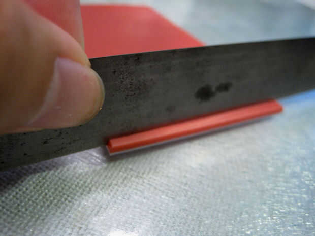 Momento de empezar a construir el salmón. Sacar una porción de la losa pulsando recto abajo en él con la hoja de tejido. Asegúrese de que la rodaja se aferra a la hoja cuando se levanta lejos.