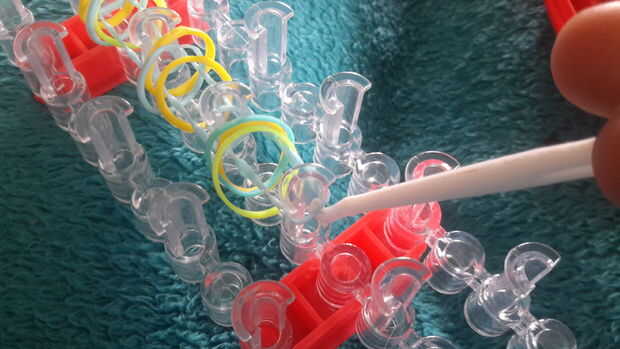 Paso 1: fuentes de Necesita un kit de inicio para el telar del arco iris y algunas elásticas.Paso 2: Colocar las bandas Iniciar colocando un color de borde y no empezar a poner encima de todo lo que tienes que hacer en los patrones.Paso 3: Colocar la
