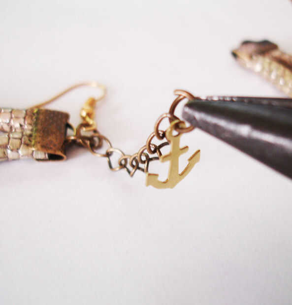 Luego tomar otro anillo de salto y usarlo para conectar el extremo de la cadena en el bucle de anclaje encanto. Lo mismo para el otro pendiente.