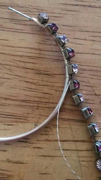 tomar el brazalete roto y alineados con el principio del post y tome el cable y enrolle el cable alrededor de la pulsera y pendiente (su mejor si Envuelva el cable alrededor de dos veces) entre los rhinestones y hacerlo hasta llegar al final del pendiente y añadir puntos de pegamento bajo la última y primera de diamantes de imitación para que sea seguro (opcional) y listo su fácil