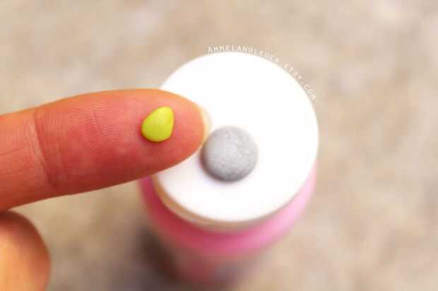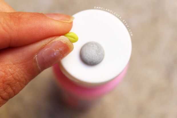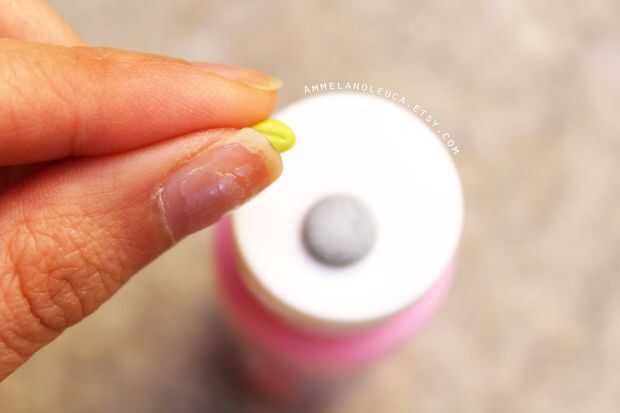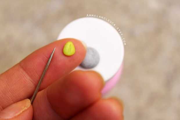 Tomar una pequeña bola de arcilla verde, la forma en una lágrima. Utilizando la herramienta de la aguja, hacer un guión de luz en el centro de la hoja.