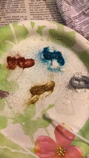 Para preparar este paso, vierta una pequeña cantidad de purpurina (de cada color que desea utilizar) en su plato de papel.