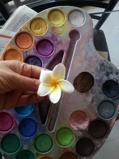 Primero di una capa gruesa de blanco, colorante amarillo del centro. Sin embargo más tarde toqué con toques de blanco, naranja y amarillo limón para oscurecerlo. También puede usar color rosa o rojo.