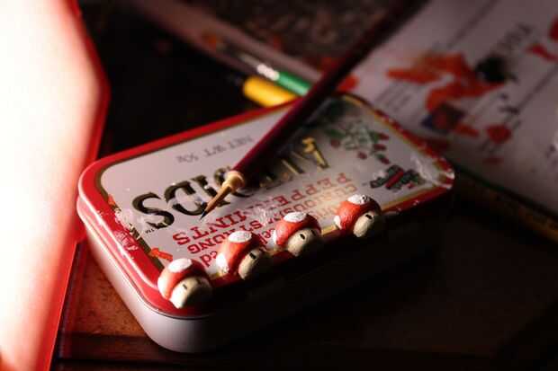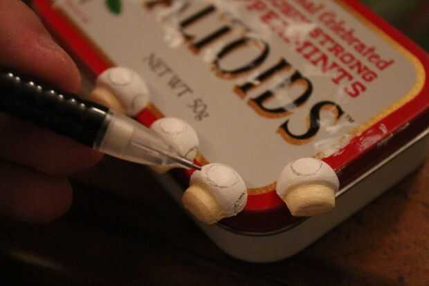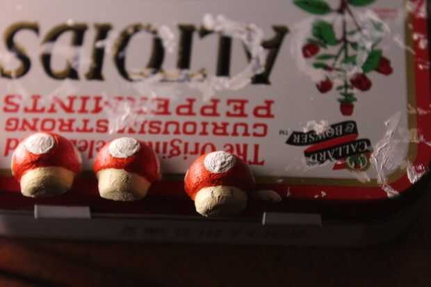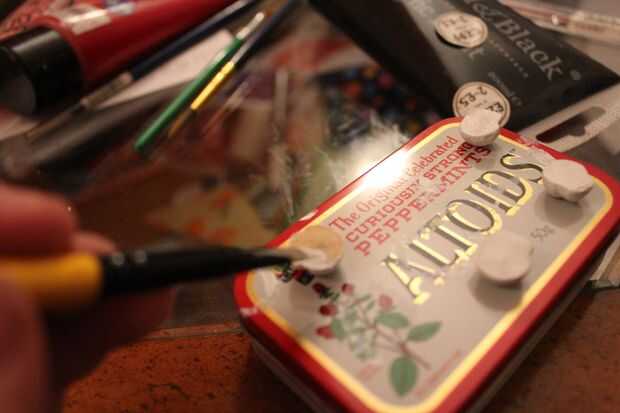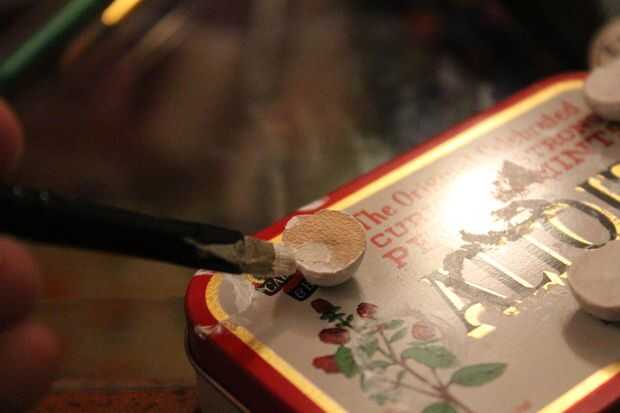 Dibujé en las setas donde los ojos deben ir y cuidadosamente, con mi pincel más fino, pintaron en pintura negra. Esperé para que seque antes de agregar el detalle blanco.