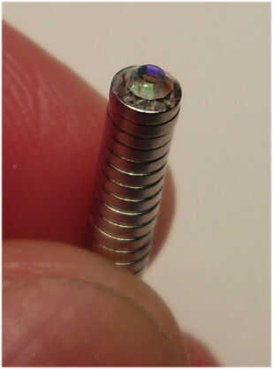 Recoger uno de los cristales con las pinzas y coloque sobre el pegamento. Usted encontrará que si tus pinzas están hechas de metal, se glom en la pila de imanes, posiblemente causando que caiga el cristal, que es la razón por unos de plástico sería mejor. Una alternativa es colocar boca abajo de un cristal sobre una superficie y luego frote el imán cubierto de pegamento sobre el mismo.