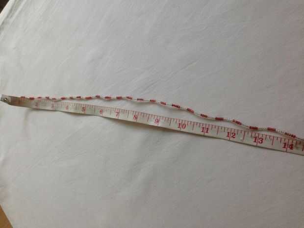 Tenía una pequeña cantidad de granos rojos, así que mezclé con los granos de cristal blanco. Llenar el alambre con perlas. Cuando usted está llenando hacer un pequeño giro en el otro extremo, para prevenir los granos caer. Si quieres que lo puedes hacer con sólo un color sólo.