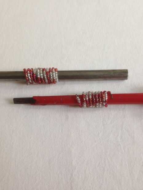 La pieza más larga del alambre se envuelve en la varilla más gruesa. Es el cuchillo número de sacapuntas 1.