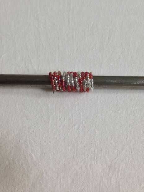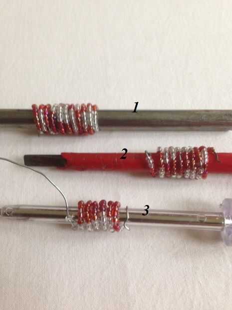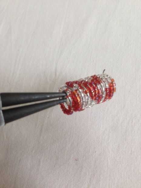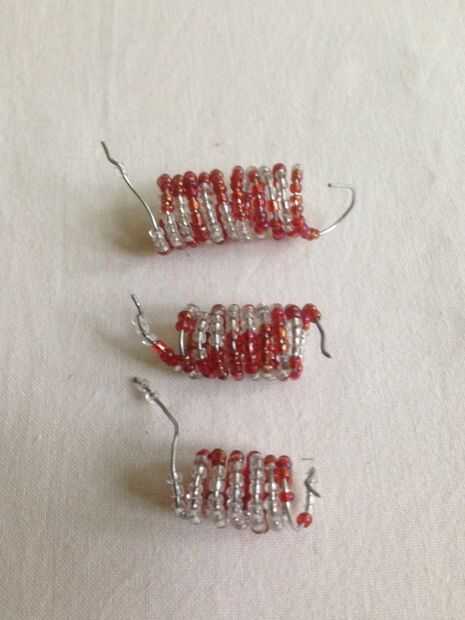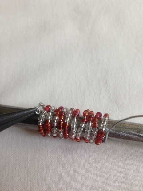 Los alambres con cuentas segundo y terceros han sido envueltos en el destornillador. Mientras que el embalaje asegurarse de que los granos están intactos cerca uno del otro. Cortar el alambre sobrante y utilizando los alicates de punta redonda para torcer un pequeño bucle en ambos extremos de los tres alambres con cuentas.