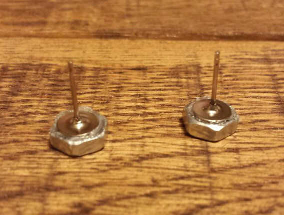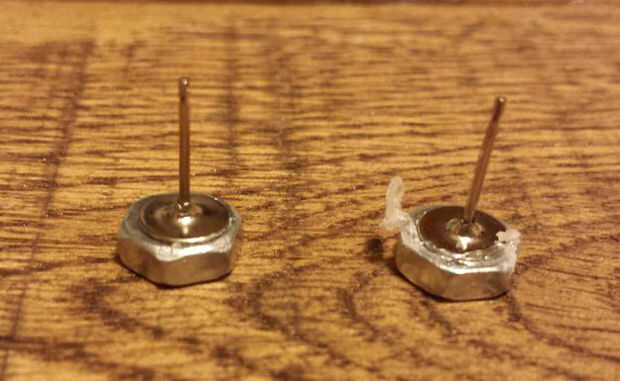 Coloque un post pendiente en el centro de cada tuerca. Presione el post sobre la tuerca de modo que cualquier exceso de pegamento o epoxi se exprime hacia fuera. Si utiliza E600, permita que el pegamento se seque por completo. Una vez que el pegamento ha secado, pude simplemente retire el exceso de pegamento (como se muestra en la segunda foto). Sin embargo, si usted decide usar J-B Weld, necesitará limpiar exceso epoxi antes de que se seque!