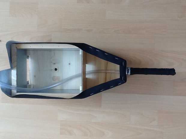 Primero poner el tubo a través del agujero y la parte frontal del tubo con el tapón del sello. Luego Utilice sujetacables para conectar el pico y el tubo. Perfore un agujero pequeño en la parte inferior del tubo donde desea que el agua salga: iI usa un perforador 3 mm. Corte un pedazo de cuero que es más largo entonces el pico y puede ser deformado alrededor del pico. Utilice a la grapadora de e en el pico (no en el tubo!).